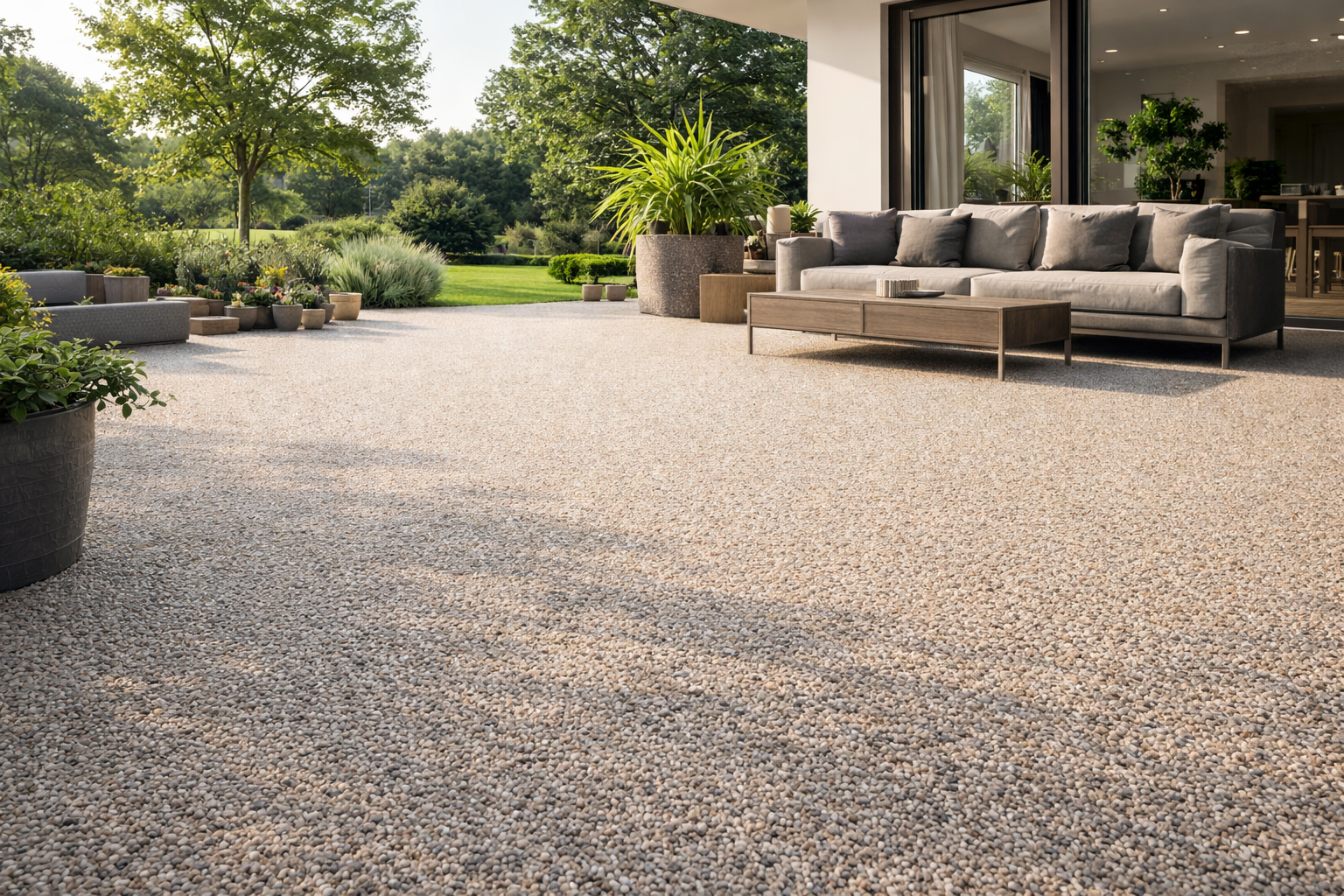 Steinteppich besteht aus abgerundeten Marmor- oder Quarzkieseln, die mit einem transparenten Bindemittel verbunden werden. Das Ergebnis ist eine fugenlose, offenporige Oberfläche, die sowohl optisch als auch funktional überzeugt.